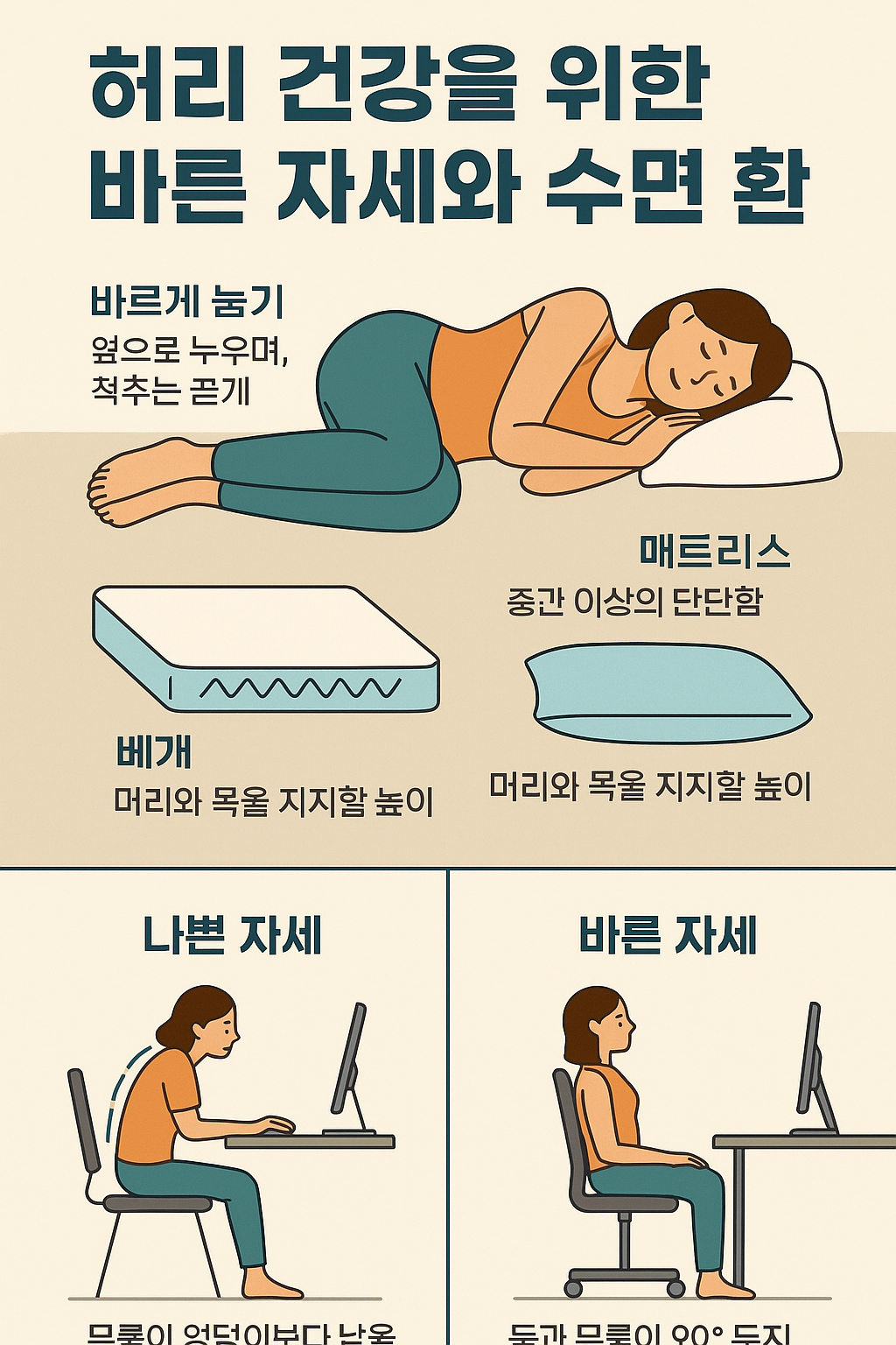 → 매트리스는 중간 강도 이상, 베개는 목과 머리를 일직선으로 유지할 수 있는 높이 추천